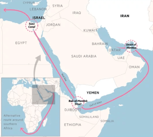 The attacks in the area risk disrupting global supply chains that depend on the Red Sea and the Suez Canal. The waterway accounts for 30 per cent of all container ship traffic and is a vital conduit for crude oil shipments… Retailers have also started warning of supply chain disruptions that could result from the vessel diversions… about 19,000 ships navigated through the Suez Canal each year, typically taking 30 to 40 days to complete an Asia-Europe voyage. Choosing this alternative route from Asia to Europe may extend the journey by three to four weeks.