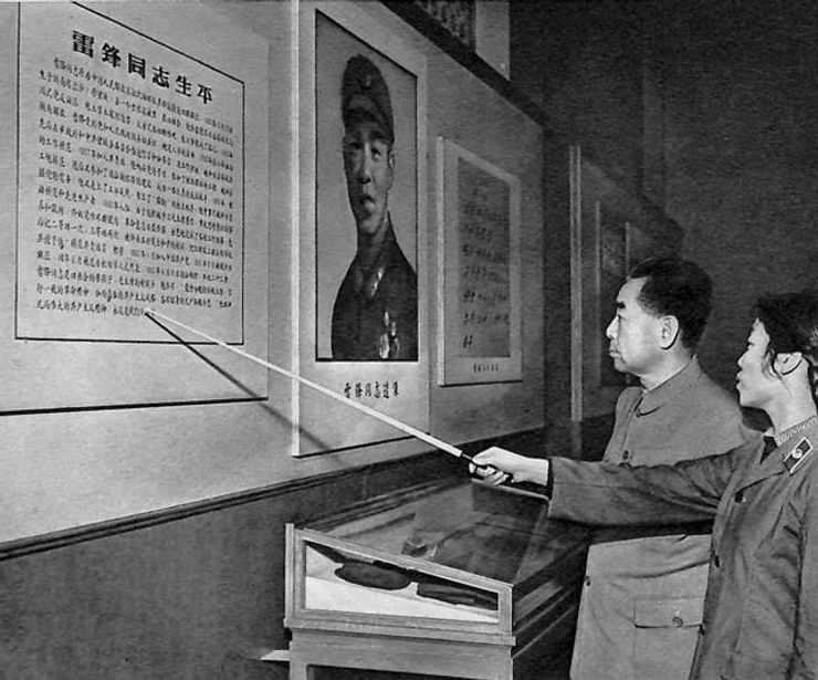 Premier Zhou Enlai visits an exhibit in March 1963 dedicated to the life of Communist hero Lei Feng after his death, leaving a notable inscription