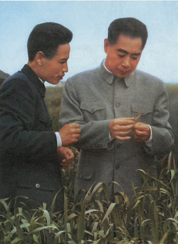 Comrades Zhou Enlai and Li Xiannian visit the rural communal Dazhai Brigade, Hsiyang County, Shanxi Province, May 1965. First from right is Comrade Chen Yonggui.