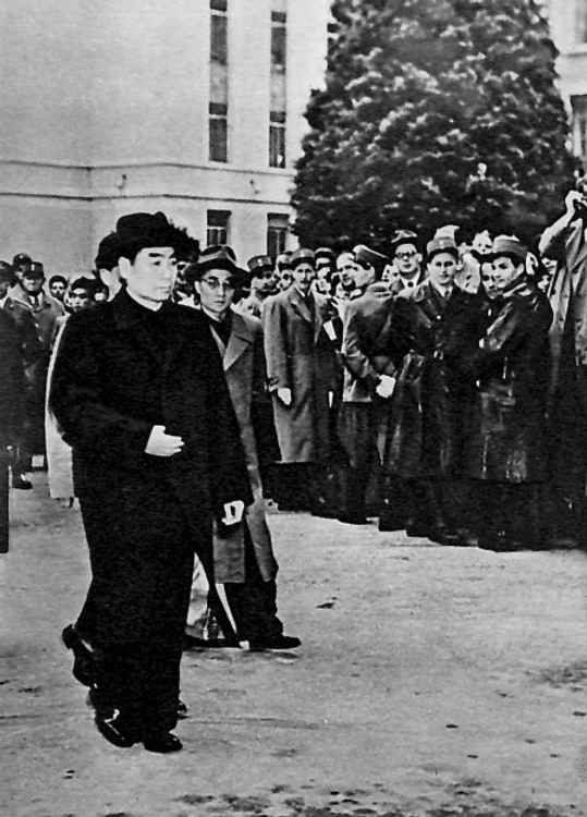 Zhou Enlai at an airfield in Yan’an after returning from negotiations that resolved the Xi’an Incident and led to a united popular resistance front with the Kuomintang against the Japanese invasion and occupation.