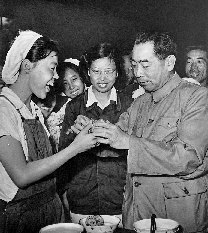 Comrade Zhou Enlai enjoying food and drink with workers at the Hantan No. 1 Cotton Mill in Hebei province, 1961