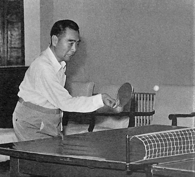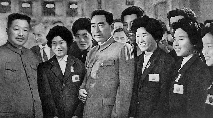 Comrade Zhou Enlai with Vice-Premier He Long greets champion Kimiyo Matsuzaki and other Japanese table tennis players on a visit to the People’s Republic, April 1961.
