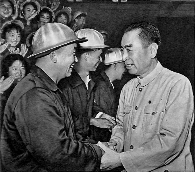 Zhou Enlai warmly greets Wang Jinxi, the “Iron Man” of the Daqing Oilfield while receiving representatives of advanced units on the petroleum front, October 1966