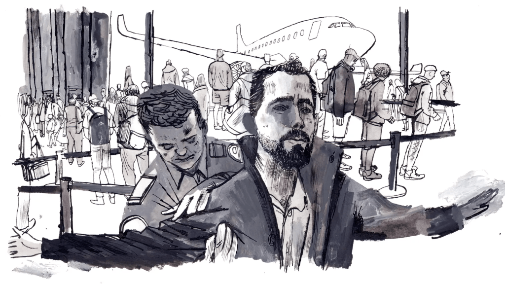 This time, I was told to pass through a metal detector and then a millimetre-wave scanner. Neither seemed to find anything. A T.S.A. employee asked if he could pat me down. I said yes. The employee ran his fingers around my collar and down my chest. Bystanders seemed to avert their eyes. I scanned the crowd and spotted my wife, Maram, in the distance, seeming to look for me. I wanted to shout to her, to reassure her, but I feared that would only make things worse. Then, with the back of his hand, the officer touched my private parts and my bottom. I knew that this sometimes happened to travellers. But for a moment, I felt as upset as I had been in Israeli custody.