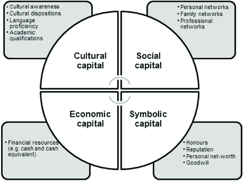 The last of Bourdieu’s capitals is called symbolic capital. Here, we’re referring to the prestige, honour, recognition or respect that a person can accumulate in a given field. I’ll let this useful little diagram fill in any blanks: