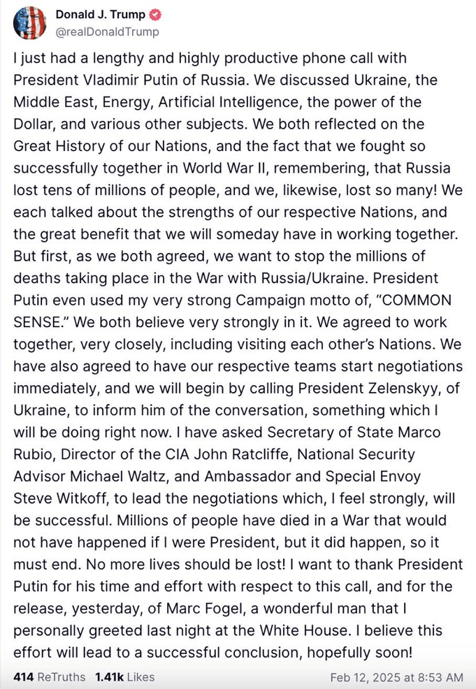 US President Trump and Russian President Putin agree to start negotiations immediately and will visit each other’s nations.
